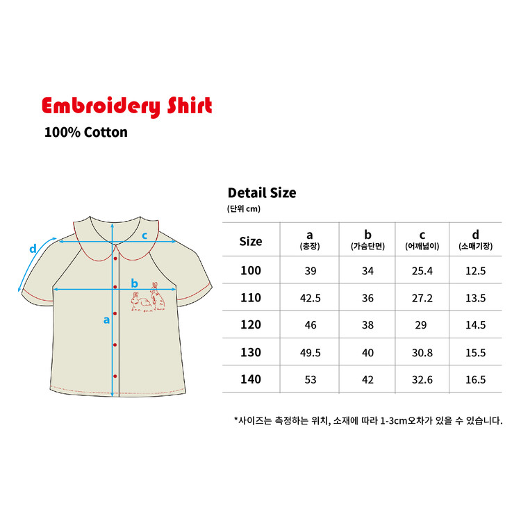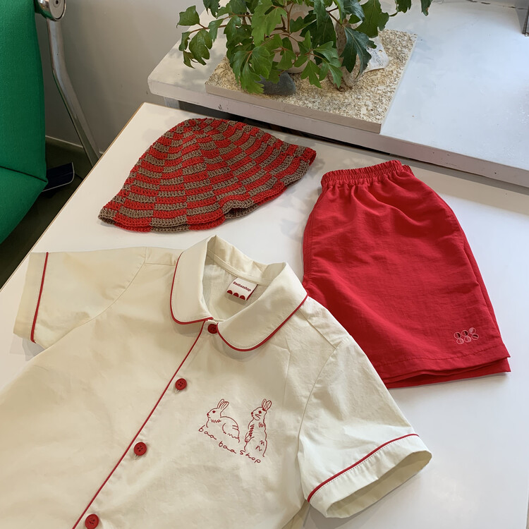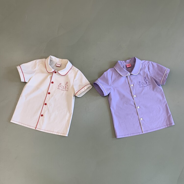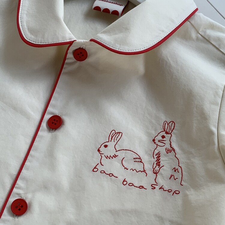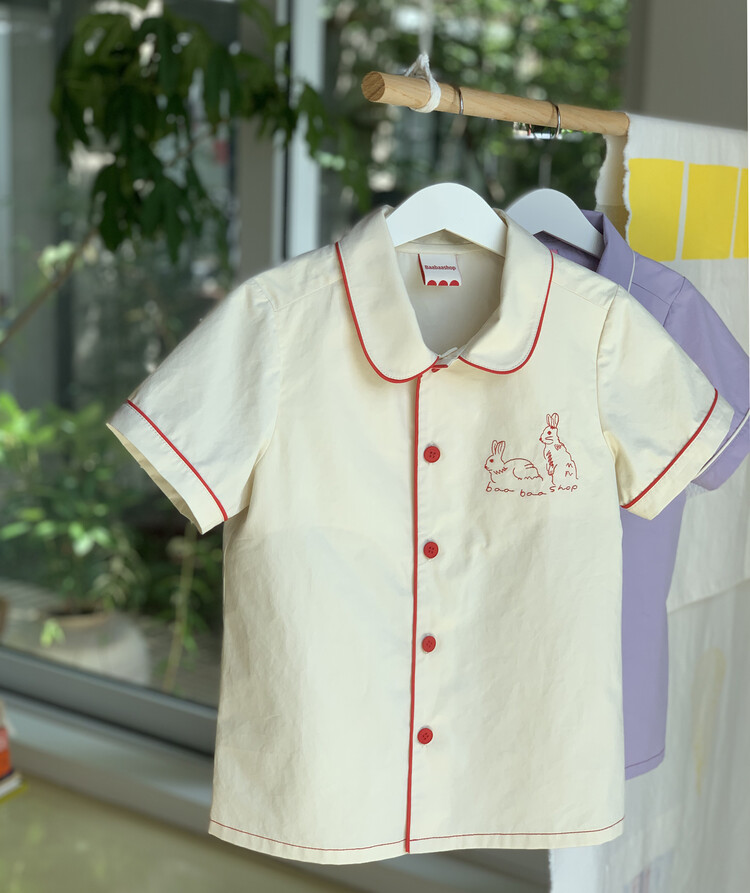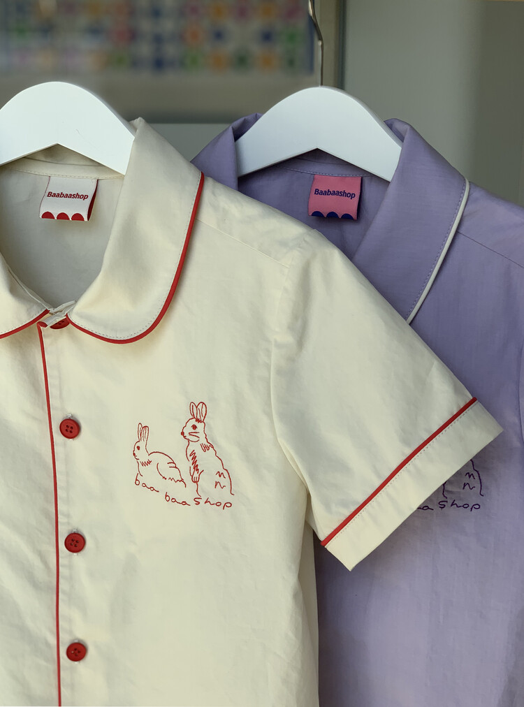 Baabaashop의 첫번째 제작 의류 상품 Embroidery Shirt 소개해 드립니다. 퀄리티 높고 바이오 워싱 처리된 40수 면을 사용하여 바바샵 만의 컬러플레이와 위트로 완성하였습니다. 사랑스러운 둥근 넥카라와 포인트 레드 파이핑, baabaashop 로고가 새겨진 레드 버튼, 왼쪽 가슴엔 신설화 작가님이 바바샵을 위해 그려주신 토끼 자수를 놓아 한층 더 귀여운 여름 셔츠를 완성하였습니다. 늘 그렇듯 선생님들의 세심한 바느질과 꼼꼼함 만듦새를 느끼실 수 있을것 입니다 :)
