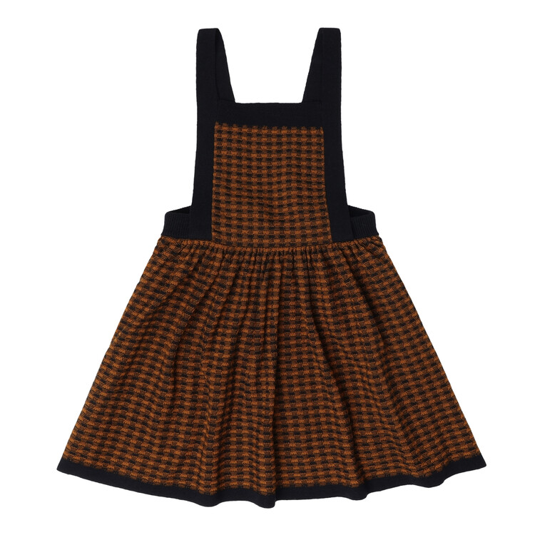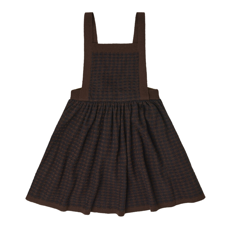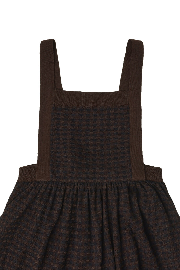Made from fine merino wool, this knee-length spencer features an elasticated waistband, adjustable braces, and a button closure with corozo nut buttons at the back. The braces can be adjusted to two different lengths. The skirt and front part of the dress are knitted in a checked structure, with creases at the waist. The merino wool is BLUESIGN® and RWS certified, free from harmful chemicals, and sourced from non-mulesed sheep.