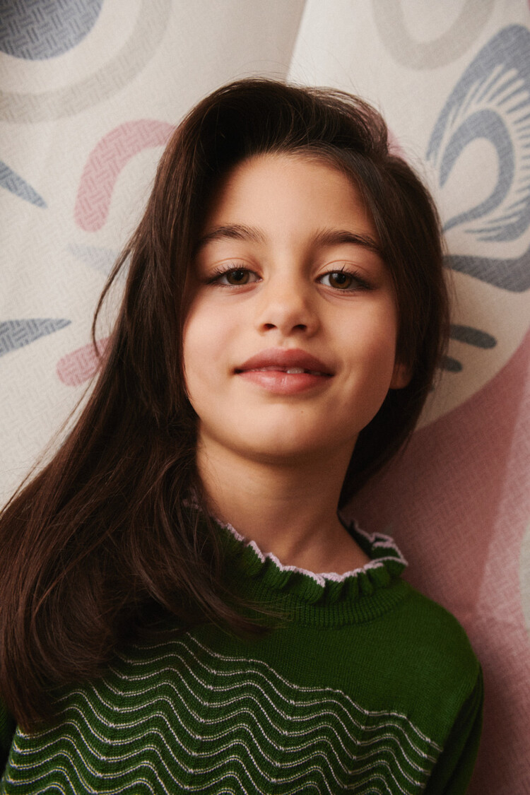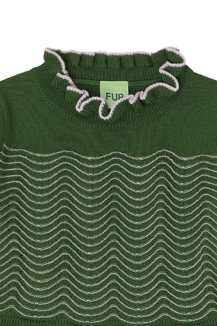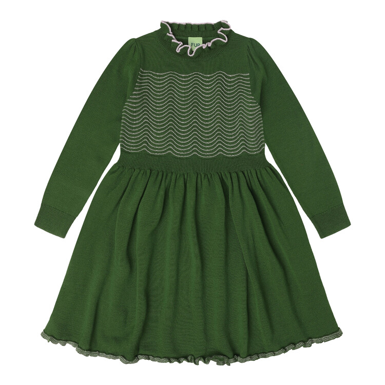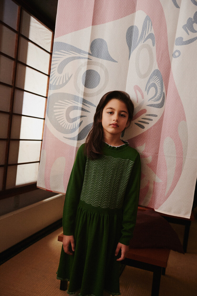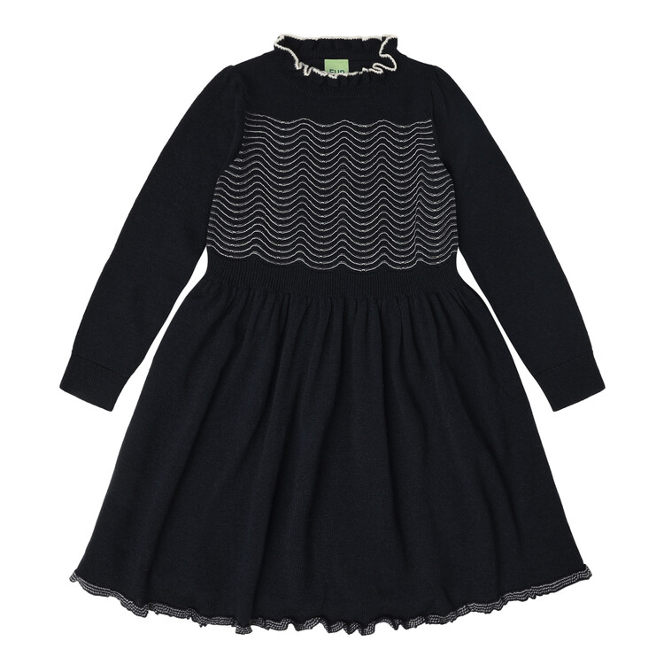 Made from pure merino wool this knee-length dress features a delicate frill collar with a contrasting edge, ribbed trims, and long sleeves. The soft ribbed waist creates pleats that add volume to the skirt. The sleeve and skirt are knitted in a soft single jersey, while the front body features a decorative two-toned pointelle pattern. Our merino wool is BLUESIGN® and RWS certified, free from harmful chemicals and comes from non-mulesed sheep.