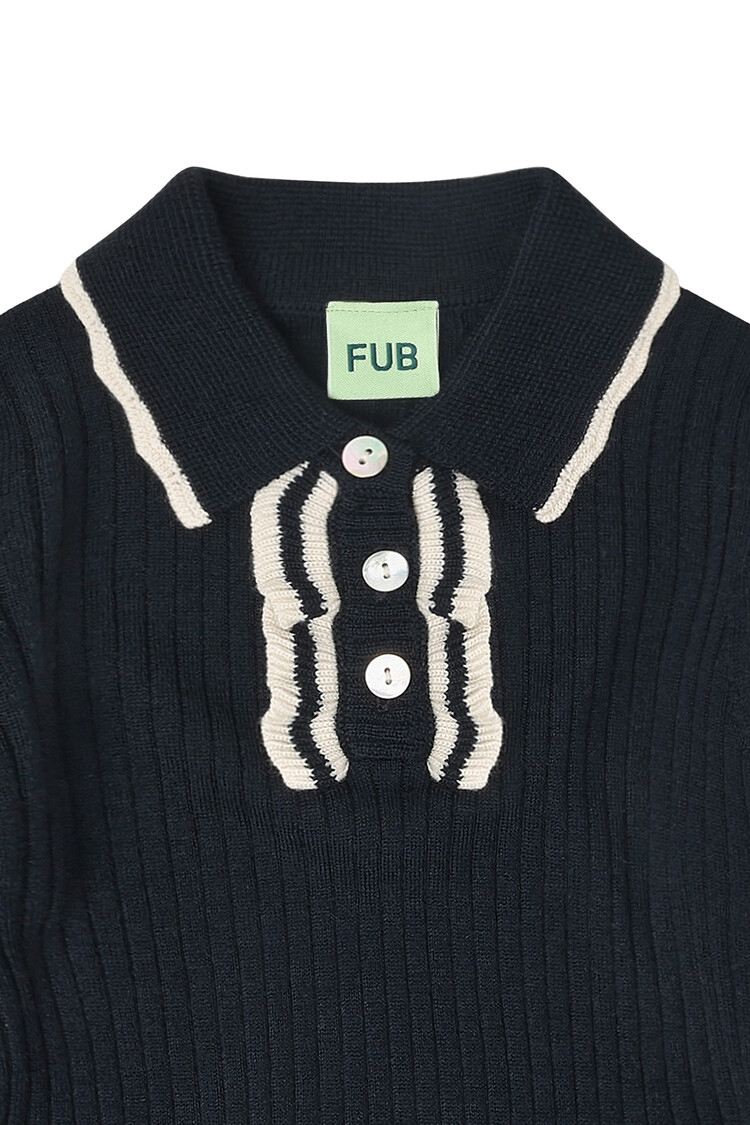 This long-sleeved polo is made from extra fine merino wool and has a straight fit. It is knitted in a classic rib structure and features a collar with a contrasting edge, frill details along the placket, and frilled sleeve hems. The front placket is finished with pearl shell buttons. The merino wool is BLUESIGN® and RWS certified, free from harmful chemicals, and sourced from non-mulesed sheep.