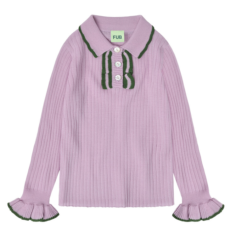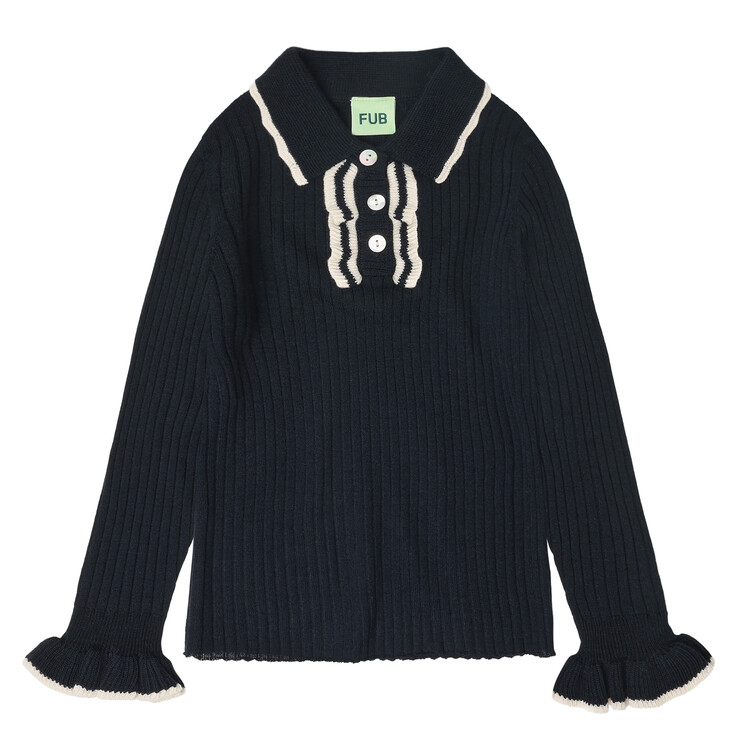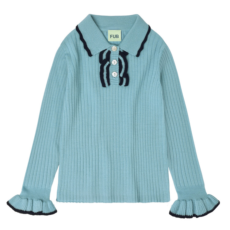 This long-sleeved polo is made from extra fine merino wool and has a straight fit. It is knitted in a classic rib structure and features a collar with a contrasting edge, frill details along the placket, and frilled sleeve hems. The front placket is finished with pearl shell buttons. The merino wool is BLUESIGN® and RWS certified, free from harmful chemicals, and sourced from non-mulesed sheep.