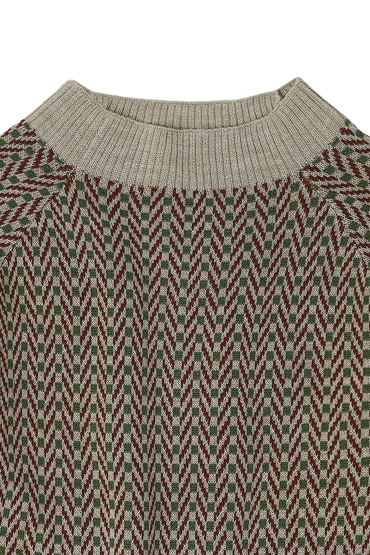 Made from a soft merino wool this jacquard sweater is designed with raglan sleeves and a regular fit. It features a high round neckline and rib hems. This sweater is knitted in a graphic herringbone pattern. The merino wool is BLUESIGN® and RWS certified, free from harmful chemicals and comes from non-mulesed sheep.