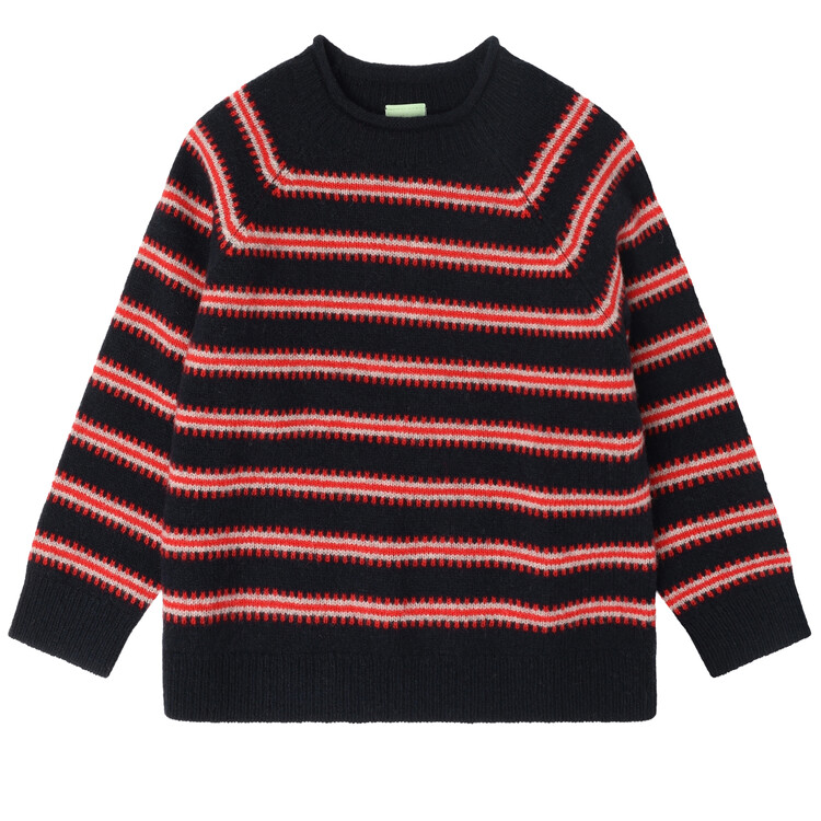 Knitted in a decorative striped pattern, this sweater has a regular, slightly loose fit. It features raglan sleeves, a round neckline with a rolled edge, and ribbed hems. Made from classic, slightly hairy lambswool. Our lambswool is OEKOTEX® certified and free from harmful chemicals.