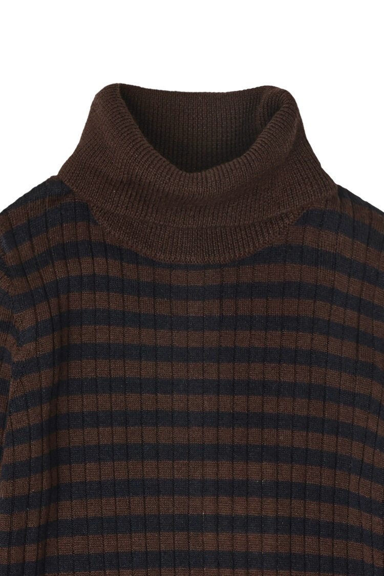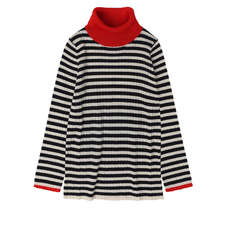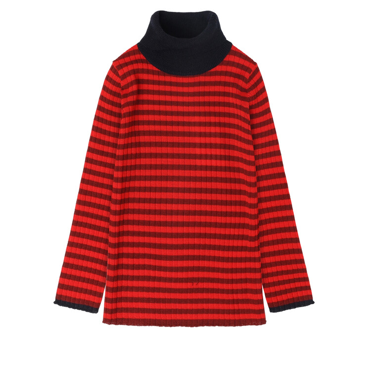 Knitted from extra fine merino wool, this blouse features long sleeves and a contrast rollneck collar. It is crafted in a striped rib structure and designed with a straight, slim fit, finished with contrast-colored edges at the sleeve hems. Our merino wool is BLUESIGN® and RWS certified, free from harmful chemicals and sourced from non-mulesed sheep.