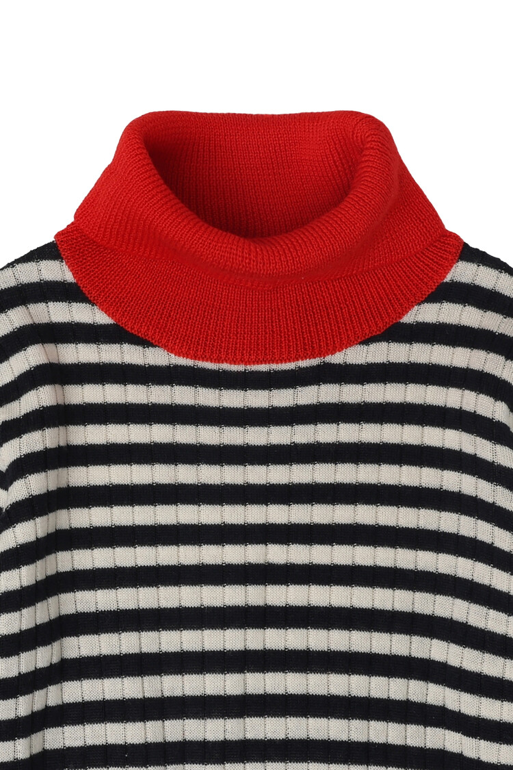 Knitted from extra fine merino wool, this blouse features long sleeves and a contrast rollneck collar. It is crafted in a striped rib structure and designed with a straight, slim fit, finished with contrast-colored edges at the sleeve hems. Our merino wool is BLUESIGN® and RWS certified, free from harmful chemicals and sourced from non-mulesed sheep.