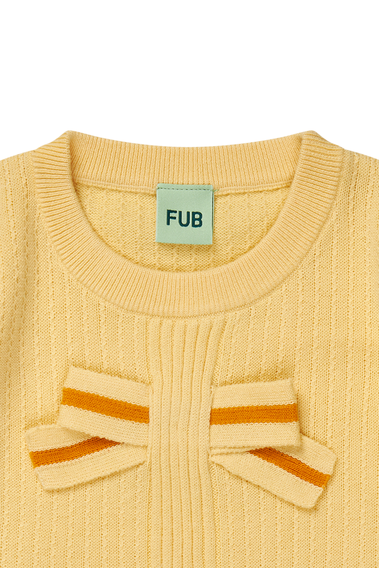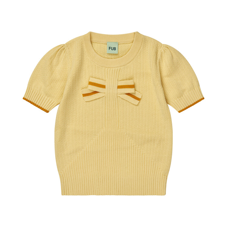 Made from organic cotton, this tee is designed with short puff sleeves, a ribbed neckline, and a contrast color stripe at sleeve edges. It features a large striped bow at the front and has a regular fit. The upper body and sleeves are knitted in a decorative structure.