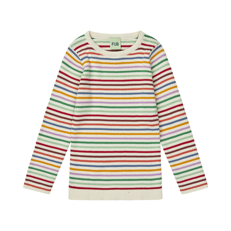 Knitted in a firm rib structure, this long-sleeved tee is a FUB classic. It has a straight slim fit and is detailed with a round rib trimmed neckline and clean self-edges at end of sleeves and bottom hemline. This blouse is available in a classic stripe and a multi color stripe and is made from organic cotton.