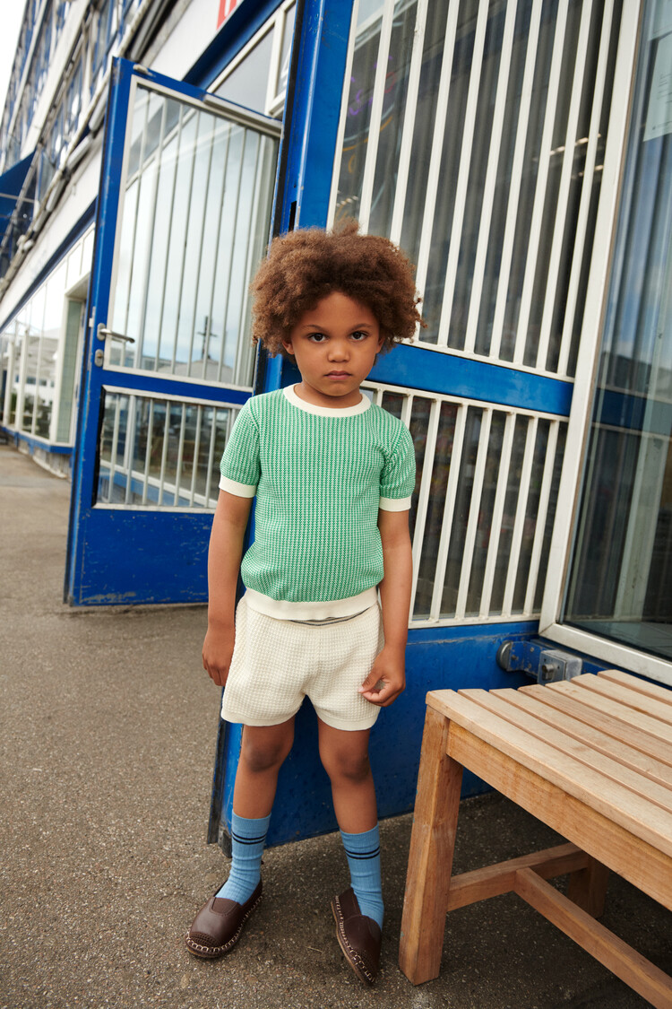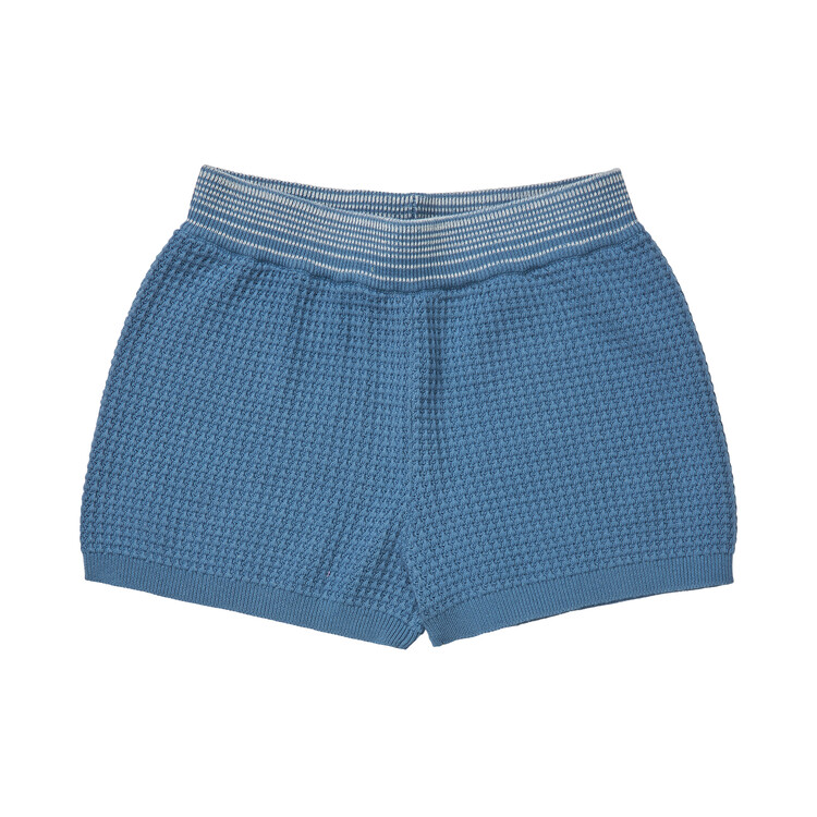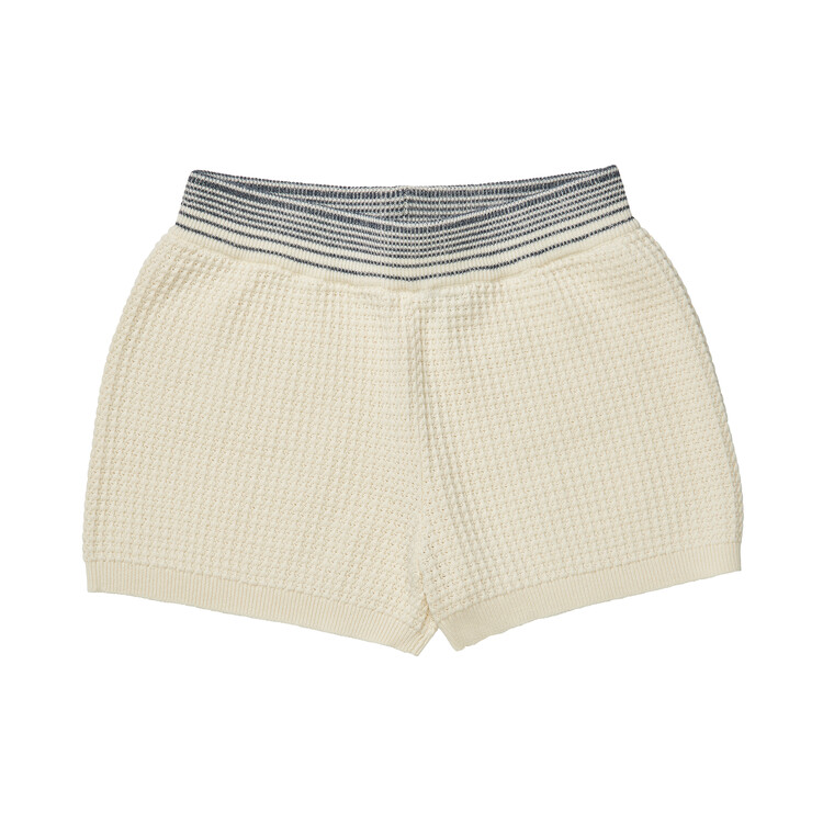 These shorts are knitted in a structure pattern and feature an elasticated waistband that ensures a comfortable and adjustable fit. Made from organic cotton and cut with a relaxed fit and rib hem. Soft and comfortable – designed to slip-on. The wide waistband features decorative contrast color stripes.