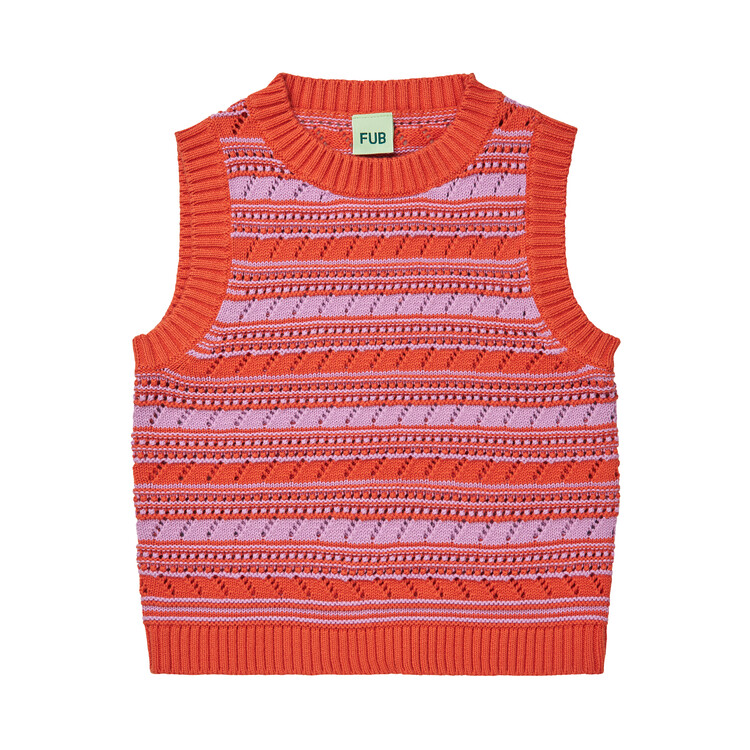 Knitted in a two-toned pointelle pattern with creative stripes this vest has a regular fit, round neckline and rib trims at armholes and bottom hemline. It is made from organic cotton and is suitable for layering or to be worn on its own.