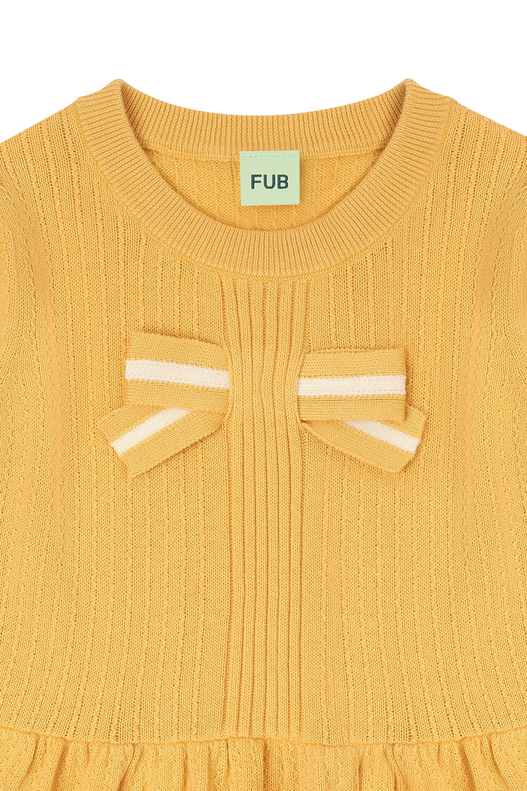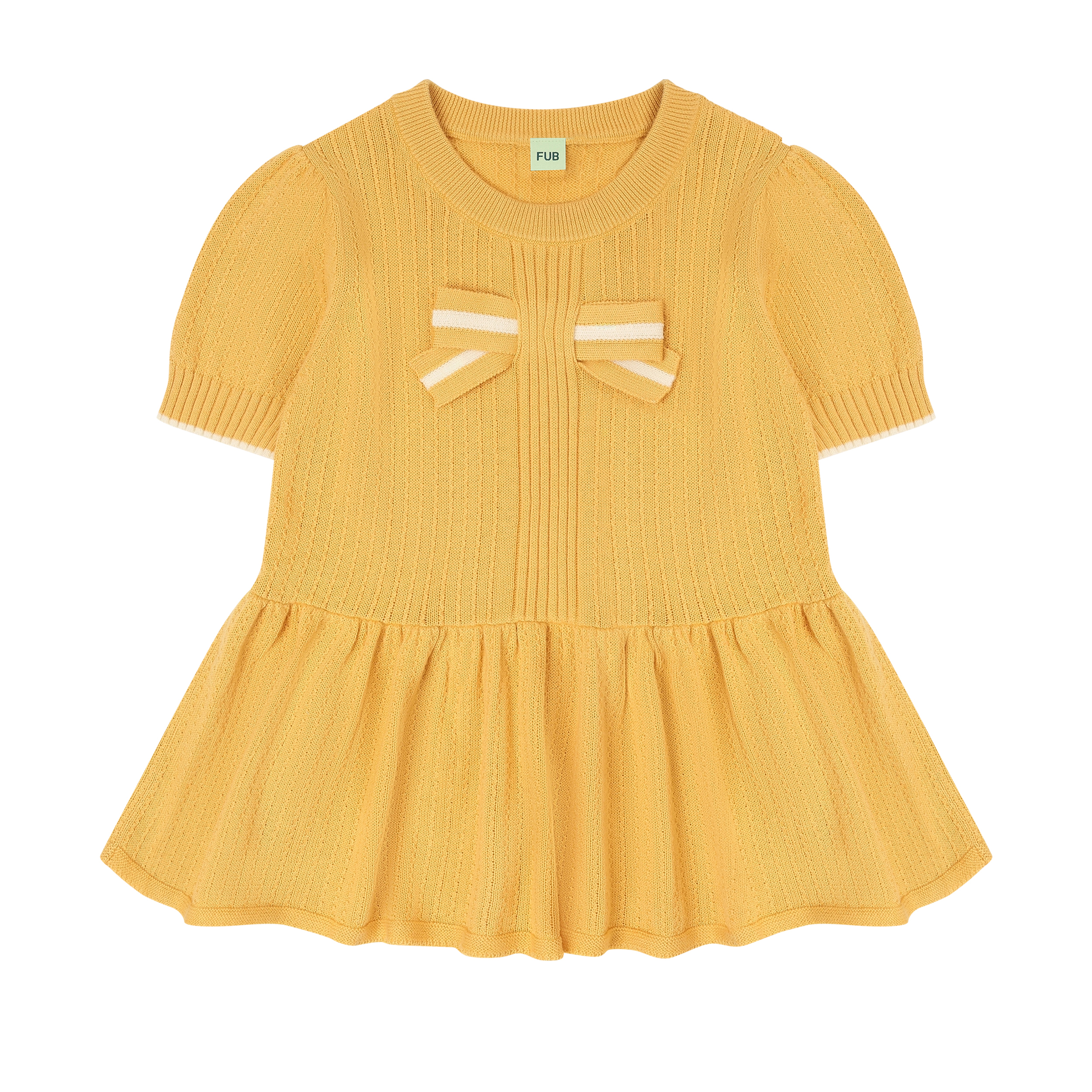 Made from organic cotton, this tee is designed with short puff sleeves, a ribbed neckline, and a contrast color stripe at sleeve edges. It features a large striped bow at the front. This top is knitted in a decorative structure and small gatherings at waist create volume to the bottom of the top.