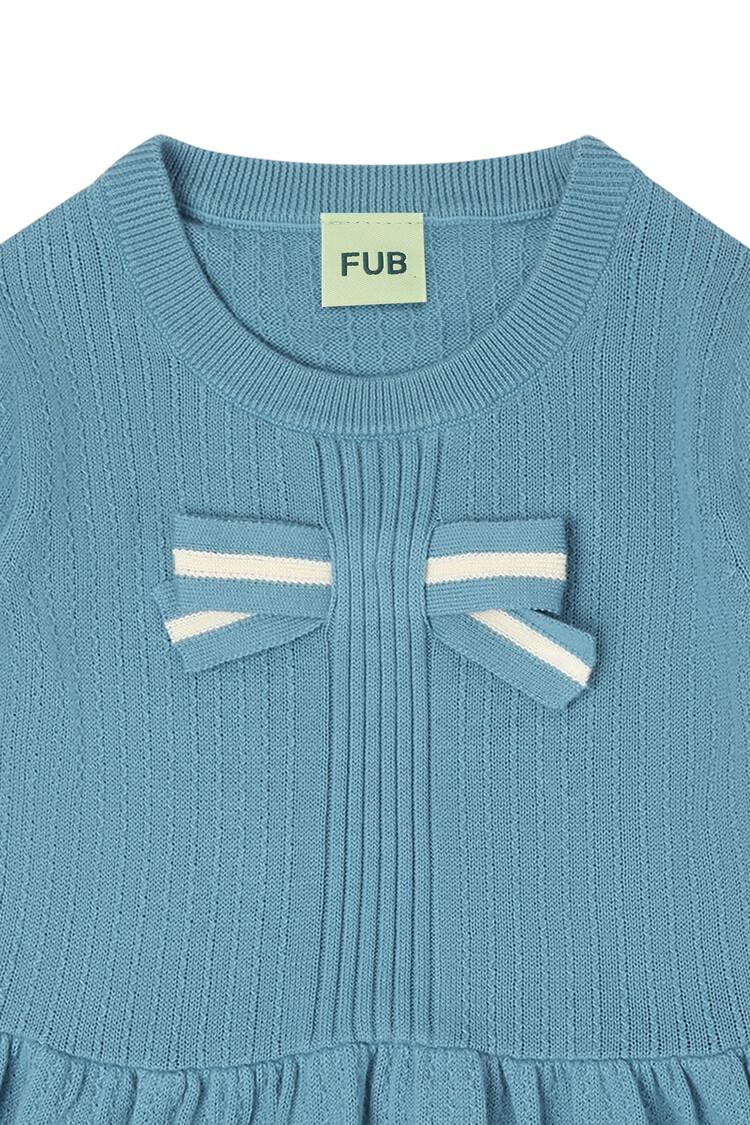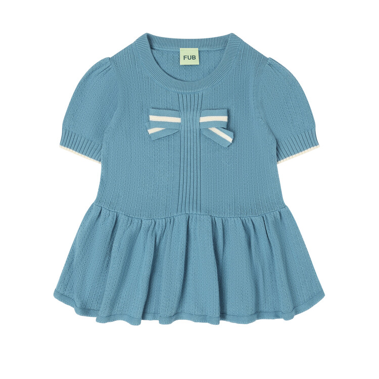 Made from organic cotton, this tee is designed with short puff sleeves, a ribbed neckline, and a contrast color stripe at sleeve edges. It features a large striped bow at the front. This top is knitted in a decorative structure and small gatherings at waist create volume to the bottom of the top.