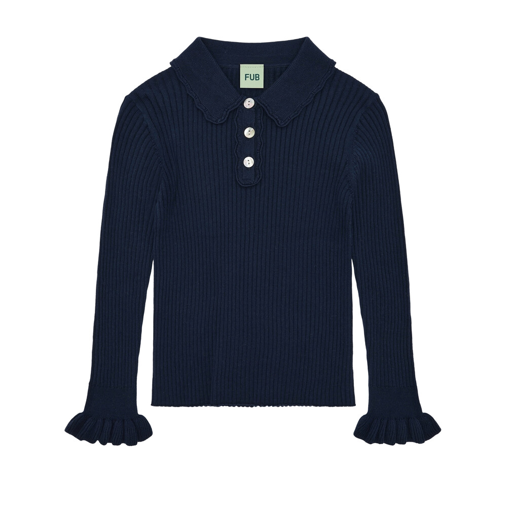 Made from organic cotton, this long-sleeved polo is designed with a small shirt color with a lace edge, knitted ruffle edge at sleeve hems and a front closure with pearl shell buttons. The polo has a straight slim fit, and the body and sleeves are knitted in a classic rib structure. Made from organic cotton.