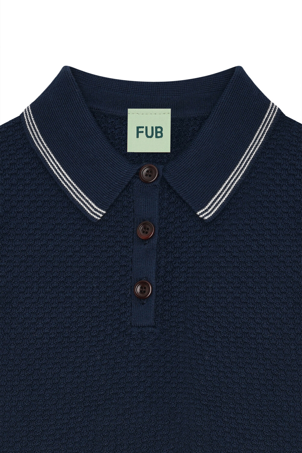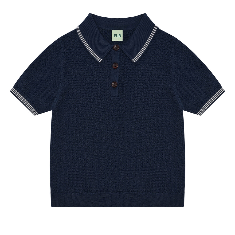 Made from organic cotton this polo shirt is knitted in a graphic pique structure. It is designed with short sleeves, a shirt collar with contrast color stripes, front closure with corozo buttons, and ribbed hems with stripes. The polo shirt has a regular fit.