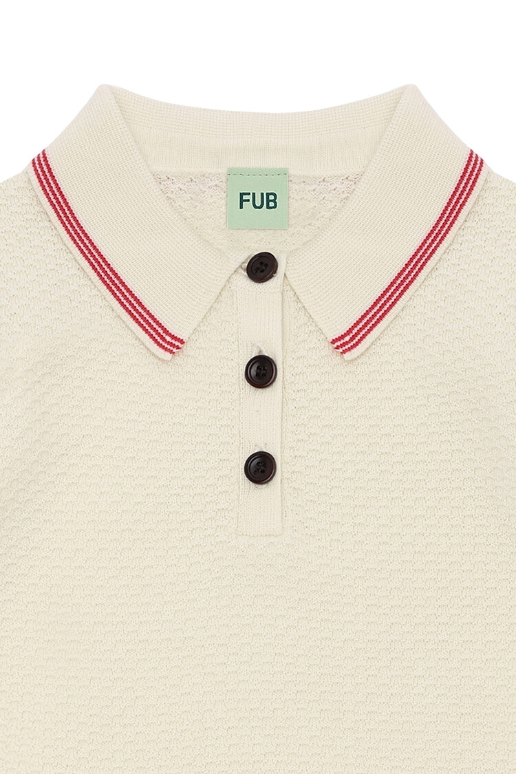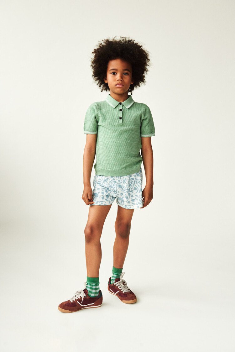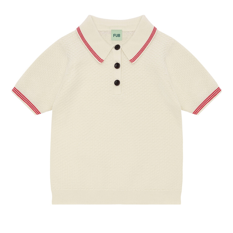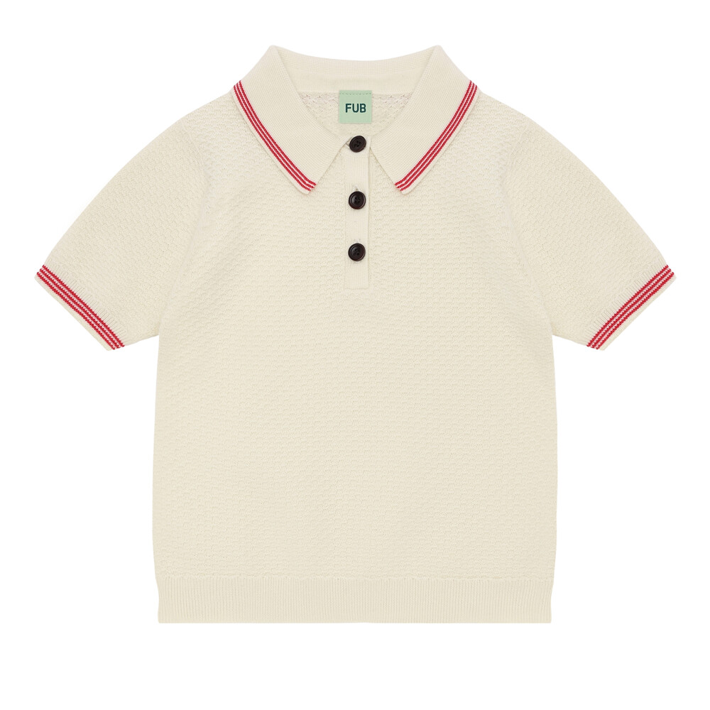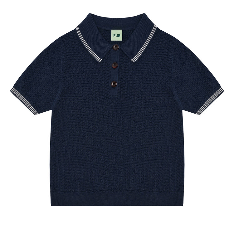Made from organic cotton this polo shirt is knitted in a graphic pique structure. It is designed with short sleeves, a shirt collar with contrast color stripes, front closure with corozo buttons, and ribbed hems with stripes. The polo shirt has a regular fit.