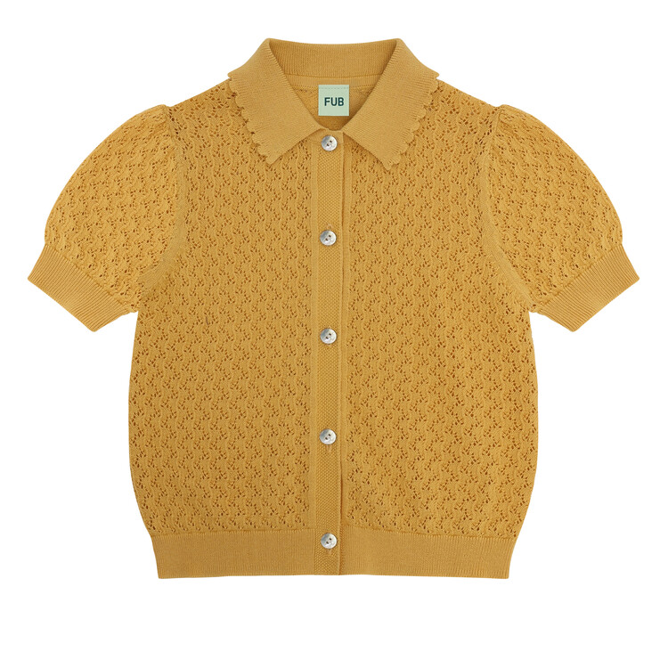 Made from organic cotton, this polo shirt is knitted in a decorative pointelle pattern. It is designed with short puff sleeves, a small shirt collar with lace edge, front closure with pearl shell buttons, and ribbed hems. The polo shirt has a regular fit.