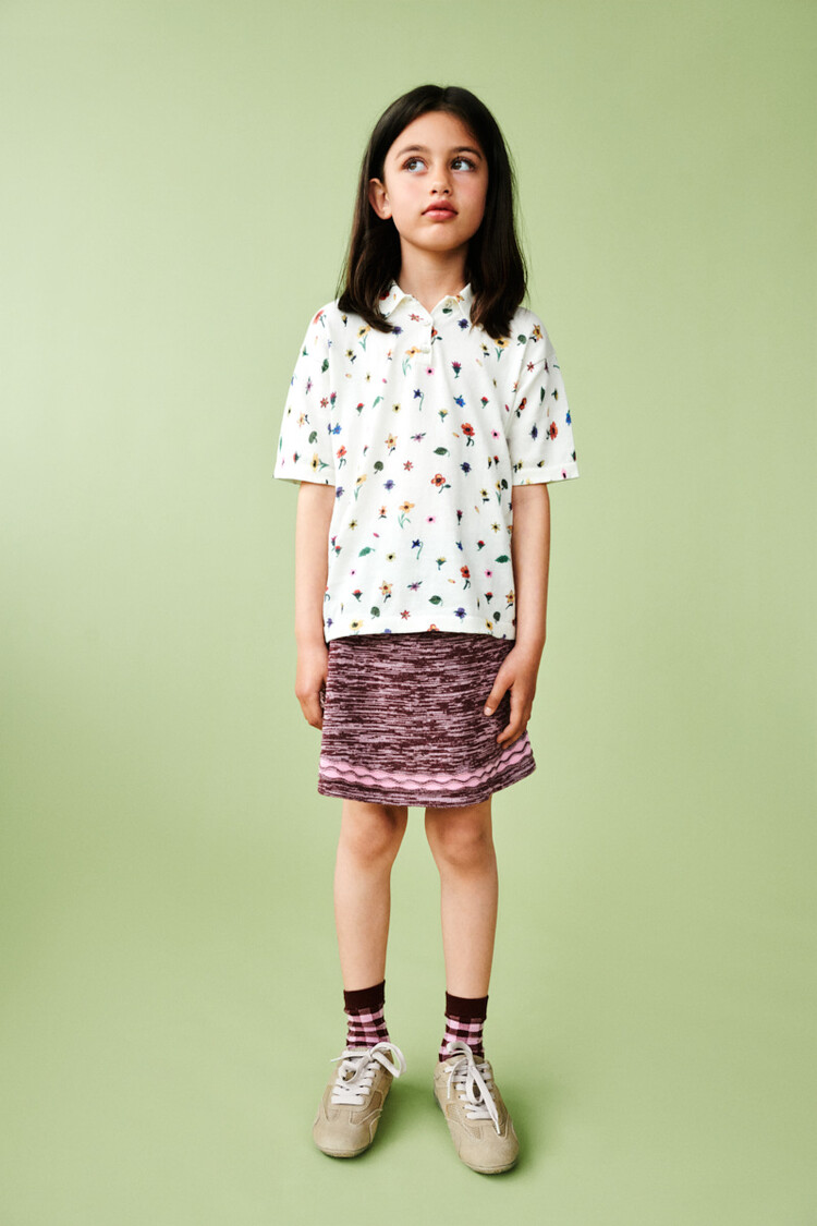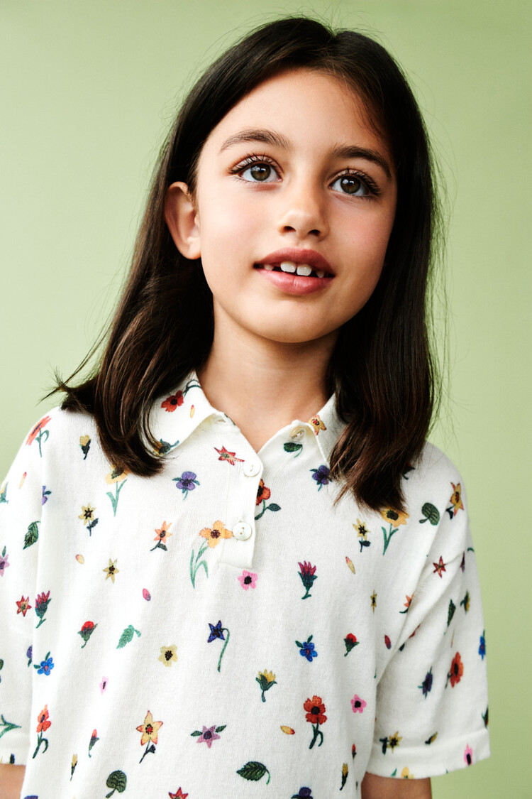 Knitted in a soft single jersey with print, this shirt features a flat shirt collar, front button closure with pearl shell buttons and folded hems. This short-sleeved shirt has a loose fit and is available in flower print and print inspired by traditional Mexican embroidery.
