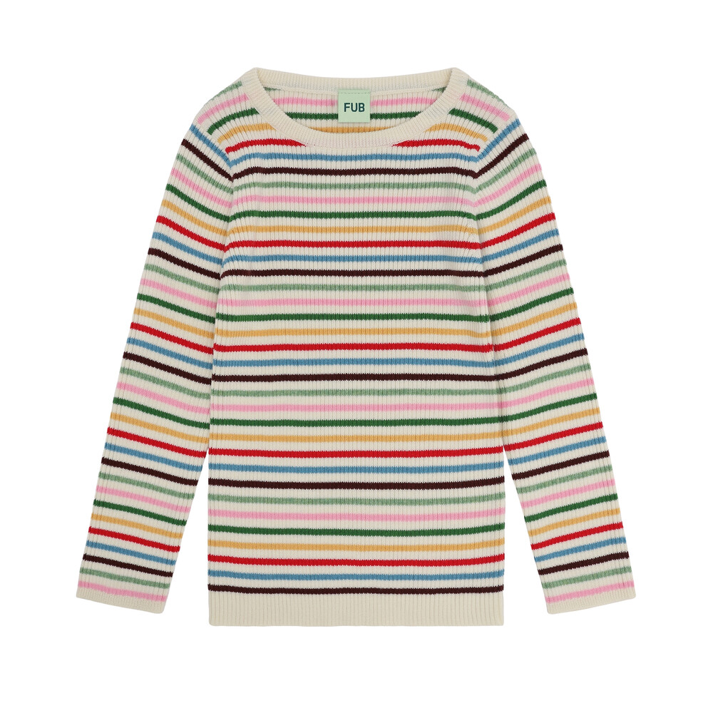 Knitted in a firm rib structure, this long-sleeved tee is a FUB classic. It has a straight slim fit and is detailed with a round rib trimmed neckline and clean self-edges at end of sleeves and bottom hemline. This blouse is available in a classic stripe and a multi color stripe and is made from organic cotton.