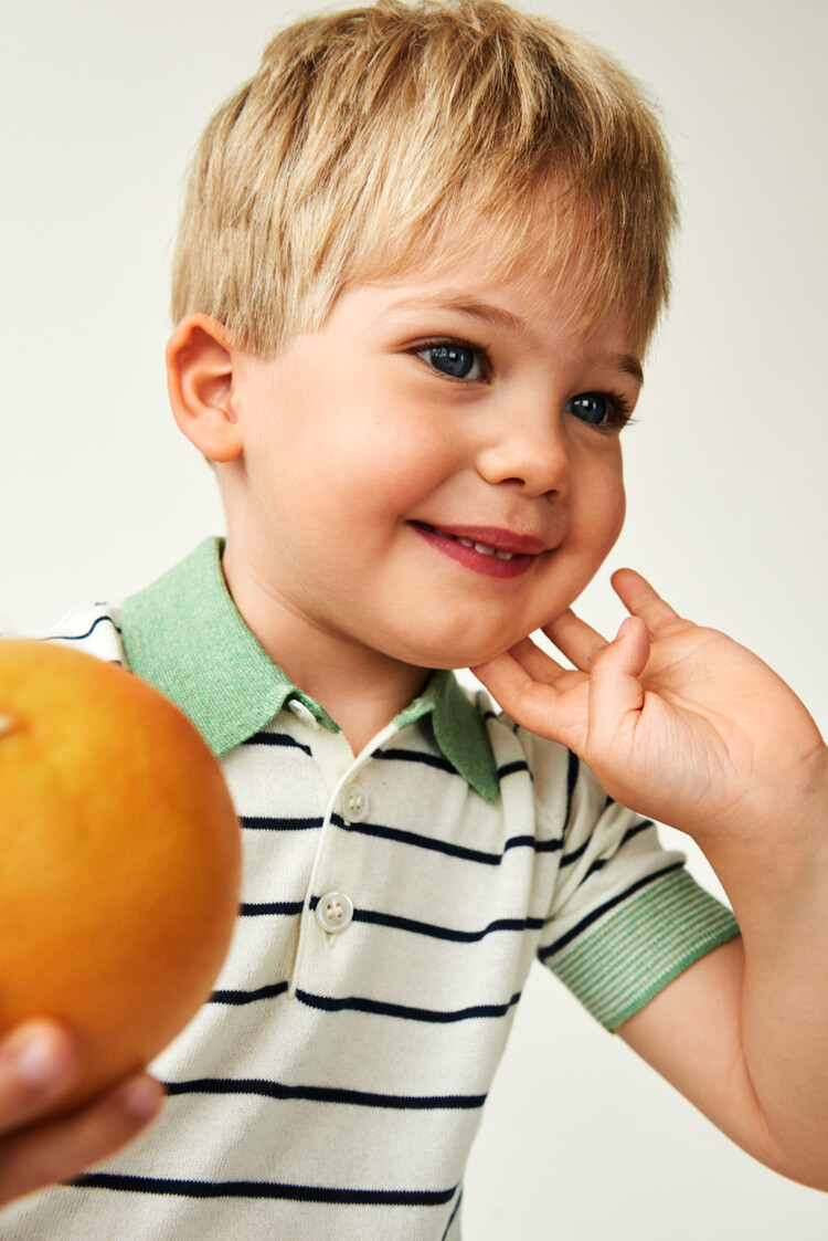 Made from organic cotton, this polo shirt is knitted in a soft single jersey with stripes. It is designed with short sleeves, a small shirt collar in contrast color, front closure with pearl shell buttons, ribbed hems and contrast color with narrow stripes at sleeves hems. The polo shirt has a regular fit.