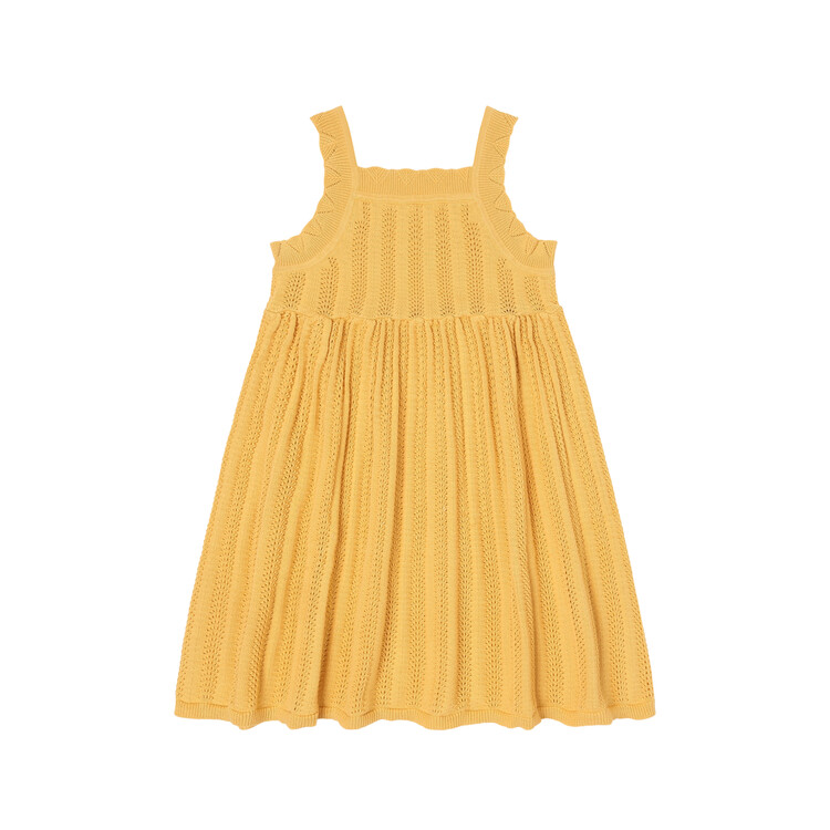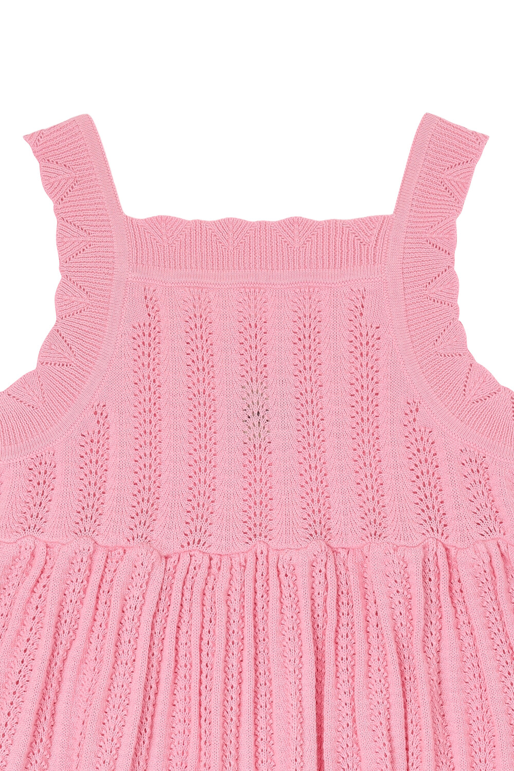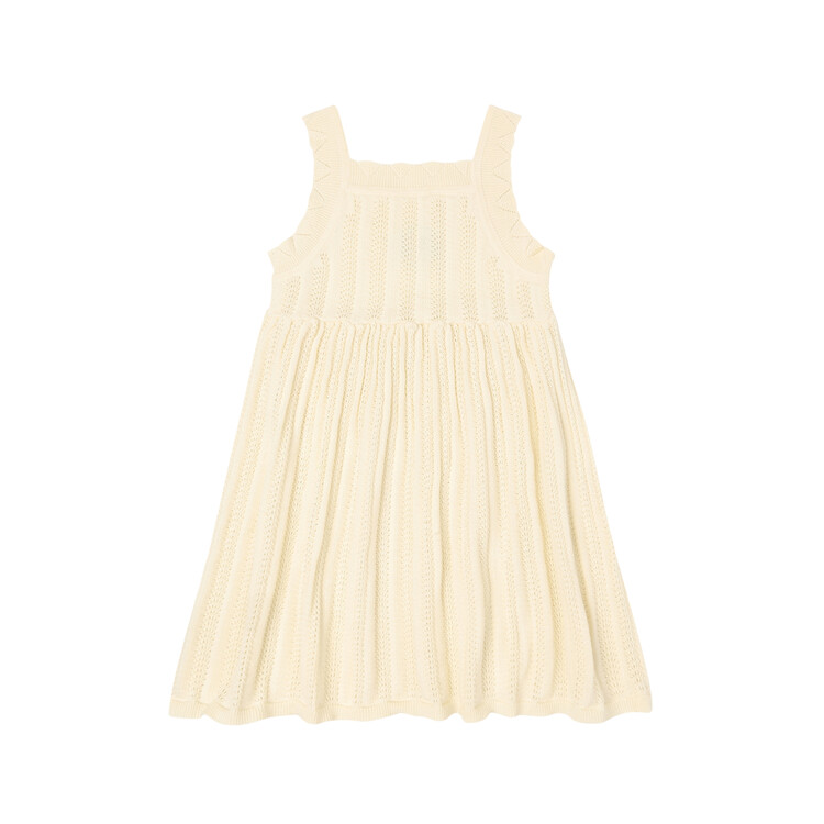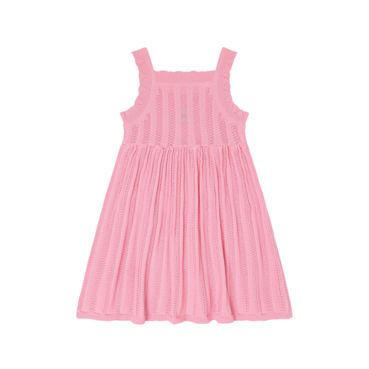 Made from organic cotton, this knee-length dress features decorative straps with pointelle details and small gatherings at the waist that create volume to the bottom of the skirt. The dress is knitted in a delicate pointelle structure.