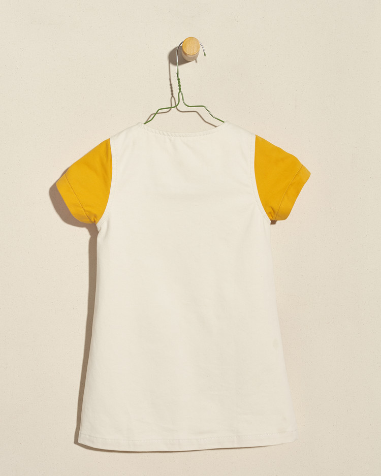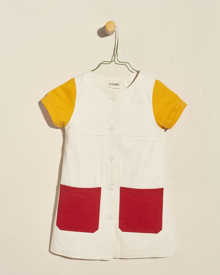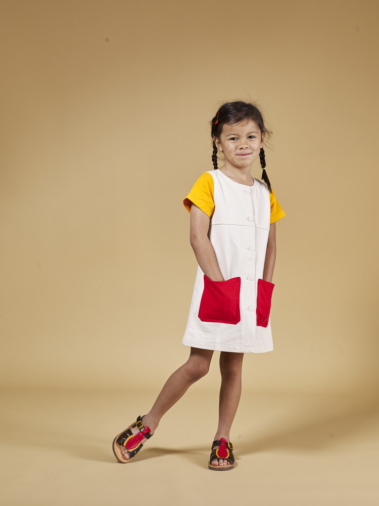 Elsa is the perfect easy throw-on dress. A timeless front bottoned dress adorned with contrasting colour pockets. Just right for playing endlessly and for days out with the family. Made in Spain.